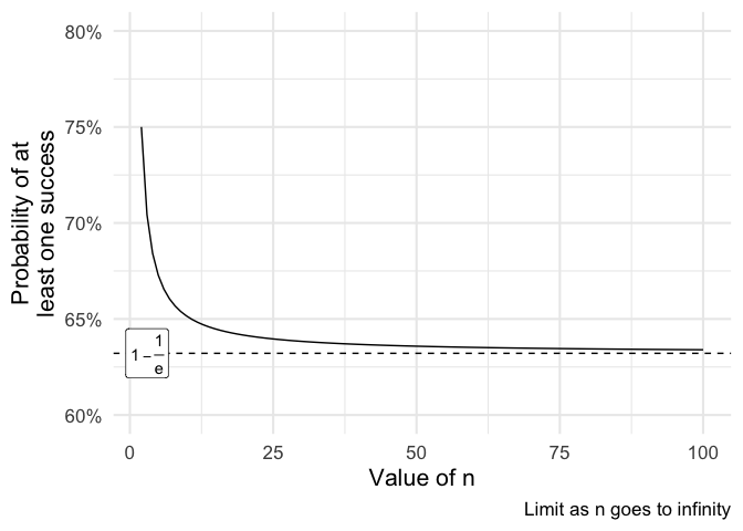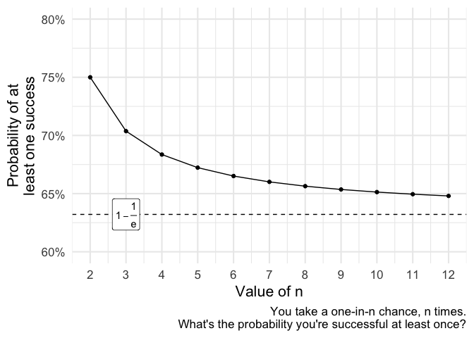 For one-in-three, it’s around \(70.4\%\). For one-in-four, \(68.4\%\). As \(n\) increases, the answer gets closer and closer to \(1 - \frac{1}{e} \approx 63.2\%\), where \(e\) is Euler’s number.