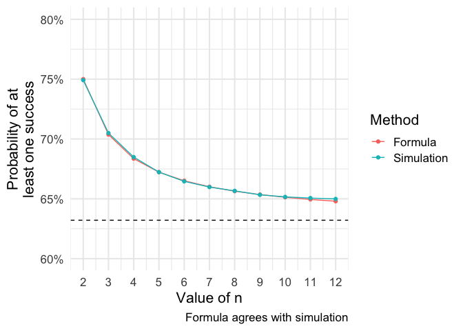 labs(x = "Value of n", y="Probability of at\nleast one success", color = "Method",
